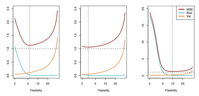 In all three cases, variance increases and bias decreases as the method’s flexibility increases. However, the flexibility level that yields the best test MSE differs among the three data sets. This difference occurs because the squared bias and variance change at different rates in each data set. In the left-hand panel of the figure, bias […]