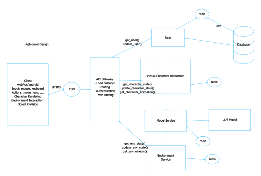 To start, this system manages real-time interactions within a virtual environment. Users control virtual characters, interact with the environment, and receive responses from a machine learning model (LLM). Our goal is to maintain high performance and scalability while ensuring that the system processes interactions instantly and reflects changes in both characters and the environment.